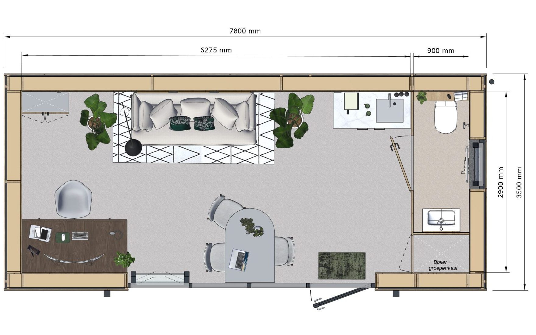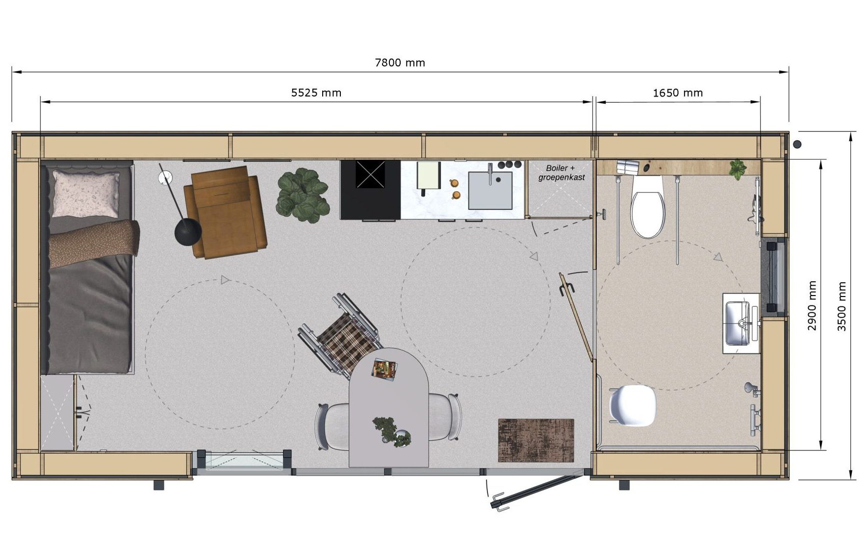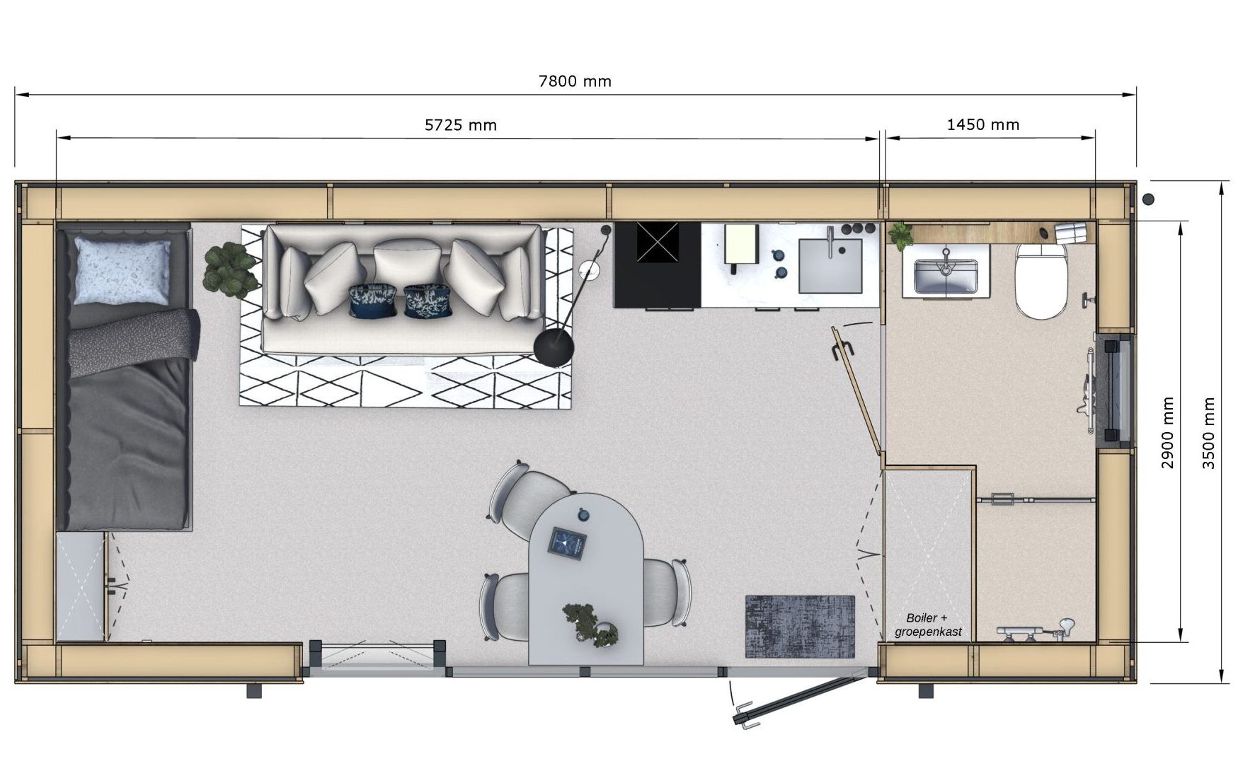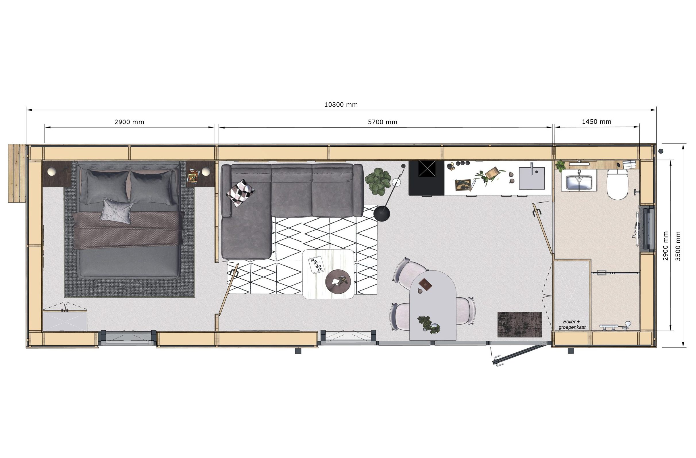 TinyFox Standaard is een slimme en complete woonoplossing voor uiteenlopende situaties. Alles wat je nodig hebt, in één efficiënte indeling.